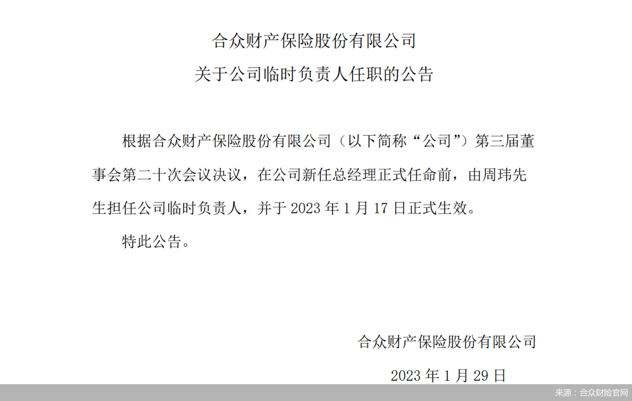 1月29日,合众财险在其官网公布了两则重大事项公告,该公司总经理吴逖因个人原因辞职,由周玮担任临时负责人。